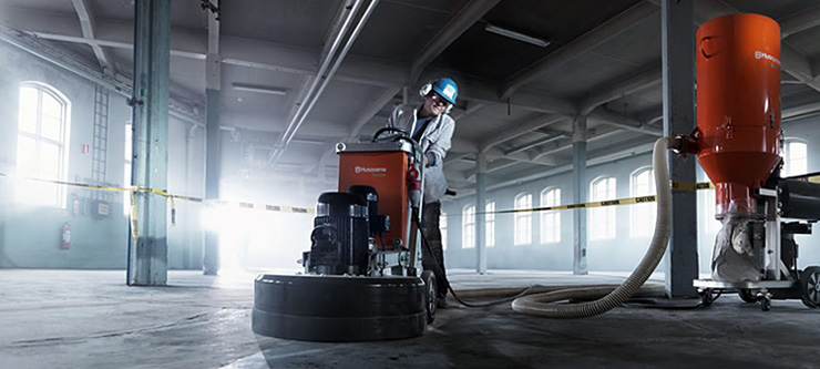 • Сухой. Его применяют в том случае, если пол полностью покрыт бетоном. При сухой обработке в воздух поднимается много пыли, поэтому лучше проводить ее в очках и защитной одежде. После работ пыль можно собрать производственным пылесосом.